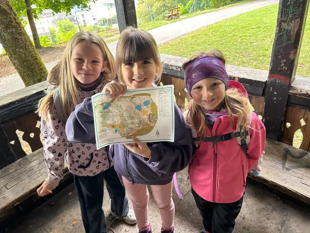 Peš smo se odpravili iz šole na Križno goro, kjer nas je že čakala Ronjina mama. Pripravila nam je iskanje zaklada. Dobili smo zemljevid in skupaj iskali označene postaje.